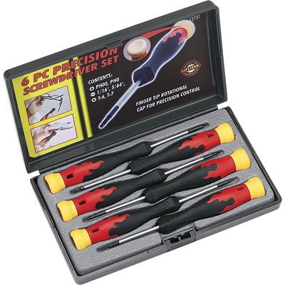 Each precision screwdriver features an ergonomically designed soft-grip handle with a cool flame design plus a fingertip rotational cap for precise control. Pieces (qty.): 6, Slotted Screwdrivers (qty.): (2) 1/16 in., 5/64 in., Phillips Screwdrivers (qty.): (2) #0, #00, Torx Screwdrivers (qty.): (2) T6, T7, Handle Type: Ergonomically Designed Soft-Grip, Case Included: Yes